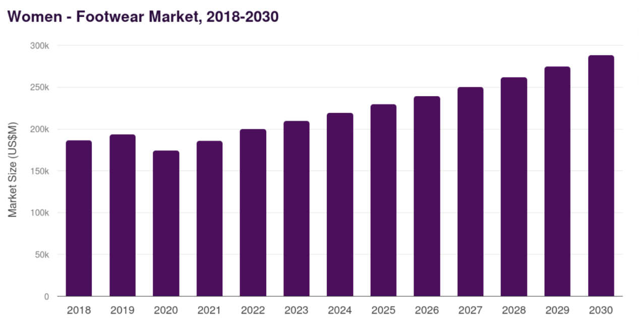 原因在于,它看到了更大的結(jié)構(gòu)性空白。數(shù)據(jù)顯示,2024年全球女性鞋履市場規(guī)模約為2187.65億美元,預(yù)計(jì)到2030年將增長至2877.84億美元,年復(fù)合增長率達(dá)4.7%。但在歐美市場,真正滿足“好看、舒服、百搭、便宜、適配多場景”這五大訴求的品牌,屈指可數(shù)。