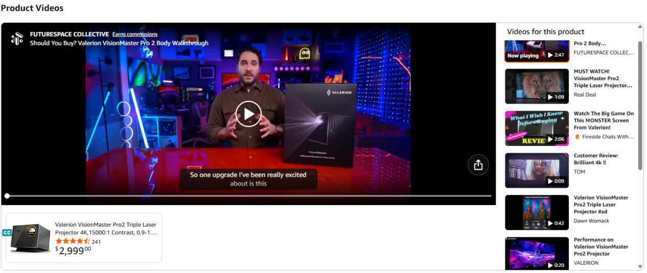 在亞馬遜產(chǎn)品頁中,大量使用真實用戶 UGC、YouTube評測截圖與動態(tài)演示動圖,強化“實測體驗”;技術(shù)參數(shù)通過FAQ+視頻詳細(xì)講解,評論區(qū)精選后院影院、地下影音室等真實場景反饋。