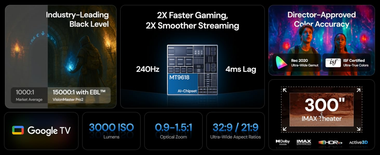 在歐美家庭場景中,高端家用投影儀要解決的不僅是畫質(zhì),更要看能否適應(yīng)真實使用情境,比如白天環(huán)境下是否清晰、安裝是否便捷、畫質(zhì)是否沉浸、是否能和家庭設(shè)備無縫聯(lián)動。