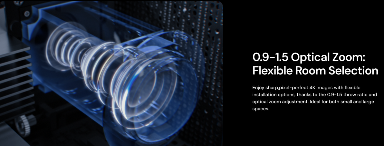鏡頭位移可達(dá) 105%,變焦比覆蓋0.9–2.0:1,能適配從大house到小公寓的各種戶型。無論墻面高低、客廳形態(tài),都能靈活擺放。同時兼容Apple HomeKit、Google Home與Alexa,輕松融入已有智能家居系統(tǒng)。
